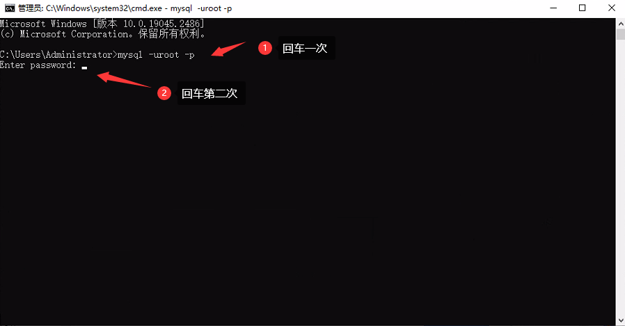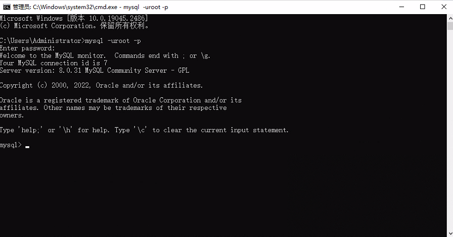 4、在新起的 cmd 窗口登录MySQL,在命令行输入:mysql -uroot -p。回车会提示输入密码,直接回车即可登录成功。