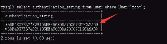 6、查看密码,密码就保存在 authentication_string 字段下,查看密码的命令是:select authentication_string from user where User='root';