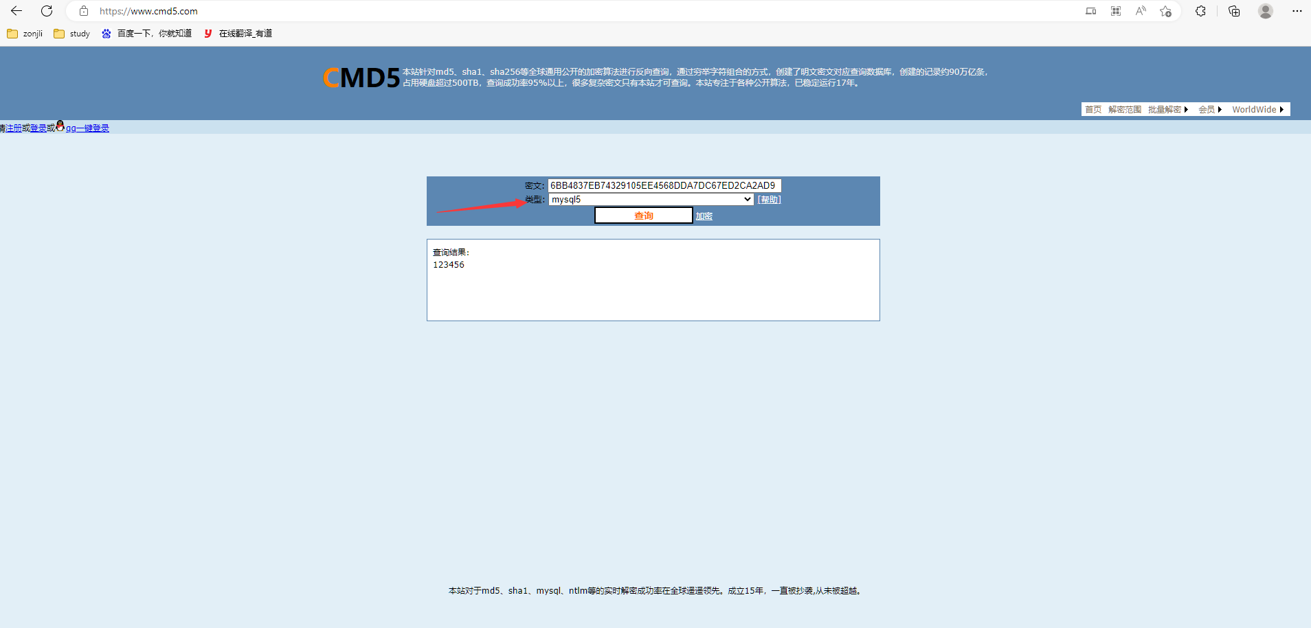 查出来的密码是经过加密的,所以需要解密。解密地址:https://www.cmd5.com/