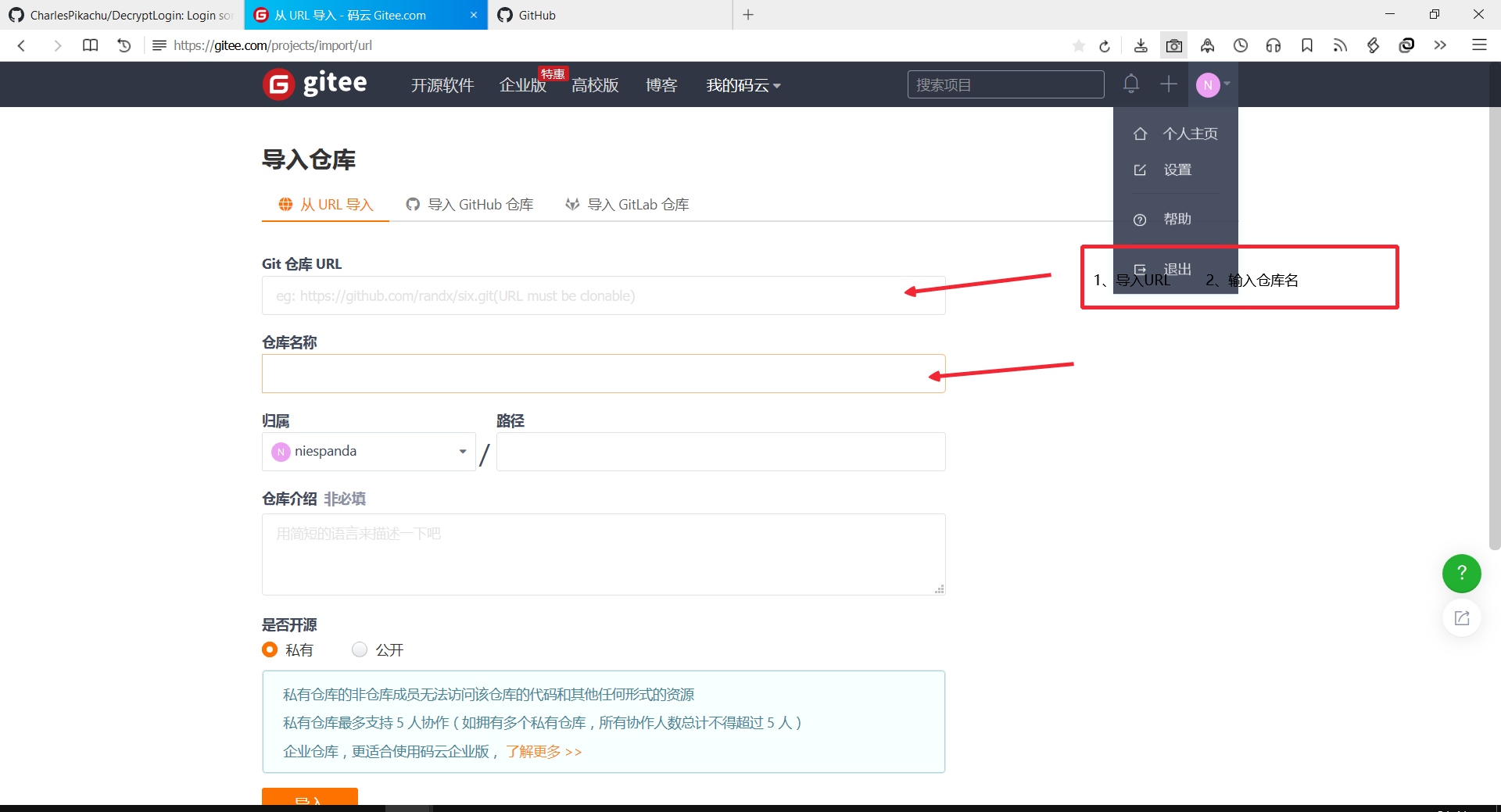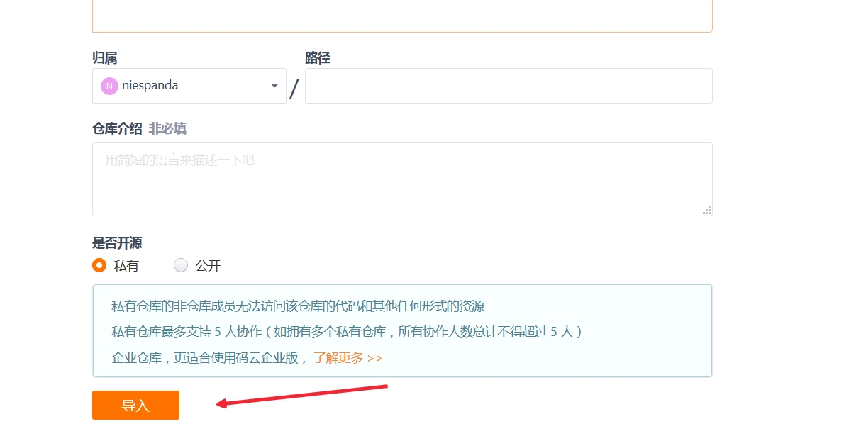 复制自己fork的项目,命名仓库名,点击导入