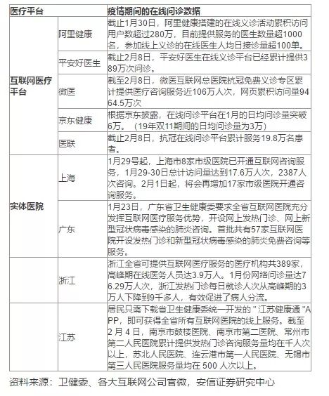 根据调研显示:自疫情爆发以来,患者线上问诊的激进性显著提升,截止2020年1月30日午间,卫宁健康上线/正在上线的153家互联网医院,累计为患者提供快速问诊服务超过10万次,开展专项培训42场。华中科技大学附属同济医院在线门诊上线首日,近400位同济专家接诊,问诊患者达1万人次。微医集团累计提供医疗咨询近64.5万人次、阿里健康累计用户数破280万、京东健康、1药网等在线问诊功能均在加速培养用户习惯。互联网医院线上问诊成为缓解医疗资源紧缺、防止疫情扩散的重要工具。同时在此次疫情之中,互联网医疗的优势充分体现,行业有望得到重视,用户习惯得到充分培养,在医保支付配套政策支持下,行业新业务、新模式有望加速发展。(根据2月8日《国家卫生健康委办公厅关于在疫情防控中做好互联网诊疗咨询服务工作的通知》中可见:国家充分肯定了互联网医疗在疫情期间的重要作用,在未来互联网首诊政策有望放开,进一步打开产业成长空间)