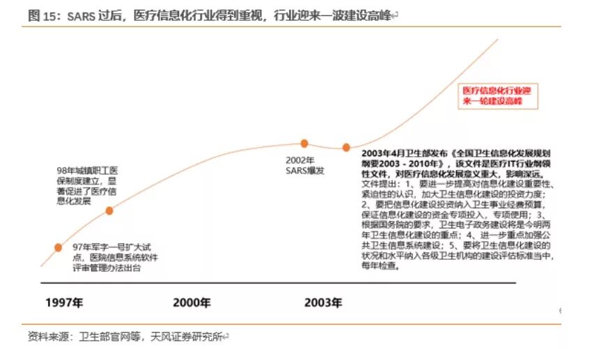 纵观国内医疗信息化发展历程,我们能够发现医疗信息化行业的最大特点是政策性极强。每一个公共卫生事件的节点,都会对推动医疗信息化的快速发展,对医疗信息化产生非常深远的影响。以03年非典事件为例:在非典爆发前,国内的医疗IT,特别是公共卫生信息化的领域,是完全不被重视的。在非典爆发之后,政府立刻意识到医疗信息化建设的重要性,一系列政策出台,建设覆盖全国的网络直报系统。这个系统在当年就开始建设,一直运行到今天。这是医疗信息化行业发展的第一个黄金时代,国内医疗信息化迎来了不可逆发展的大趋势。