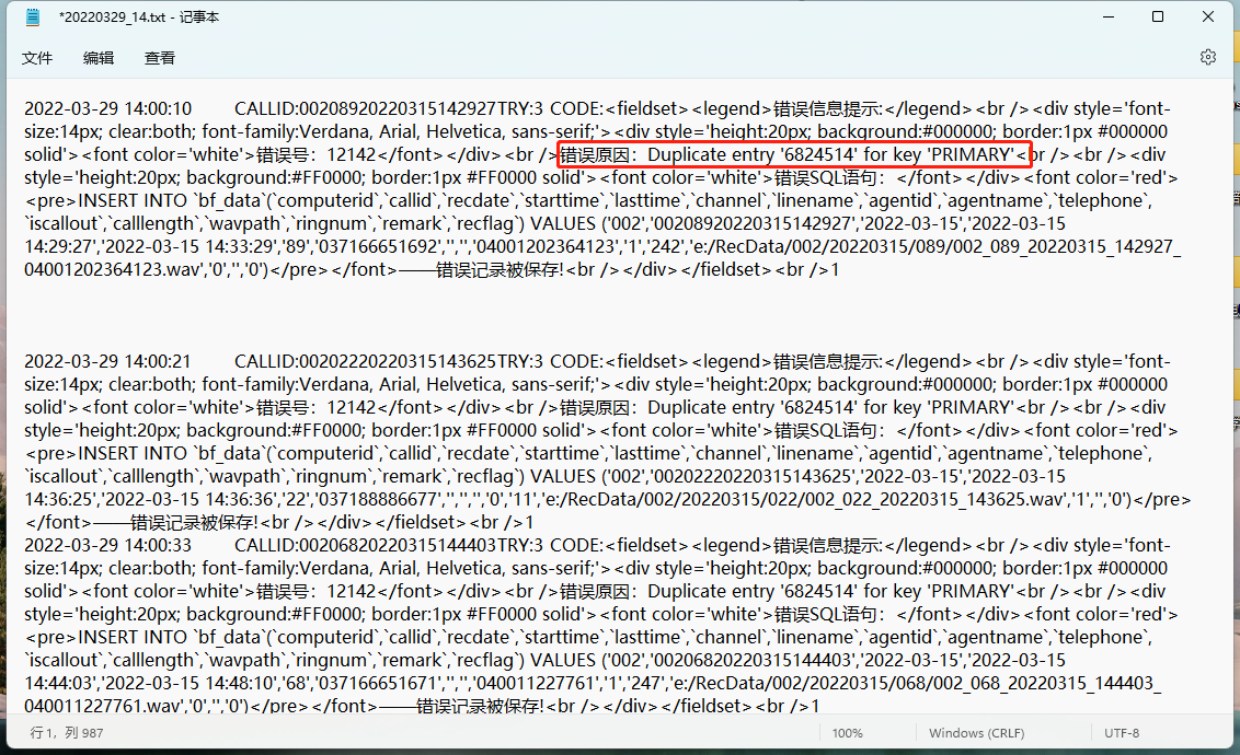 公司原来有3台老的录音服务器,还有一台录音备份服务器负责备份这三台服务器的录音并且提供WEB查询。三台服务器上分别放有主录音程序及录音备份程序。今天听同事说录音查不到了,就到录音服务器上查询发现备份程序出错。