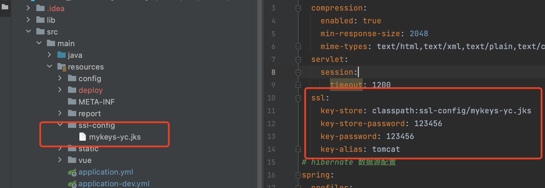 然后把生成的jks文件复制到项目目录下,在spring配置文件(application.yml/application.properties)下进行对应ssl配置
