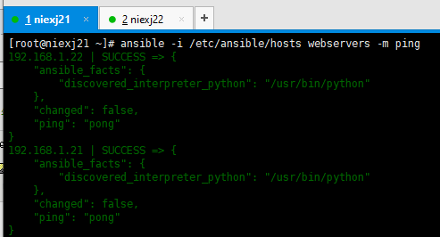[root@niexj21 ~]# ansible -i /etc/ansible/hosts webservers -m ping