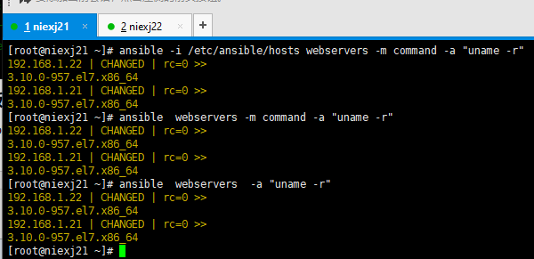 [root@niexj21 ~]# ansible -i /etc/ansible/hosts webservers -m command -a "uname -r" ## -i 默认配置文件/etc/ansible/hosts,-m 默认模块command