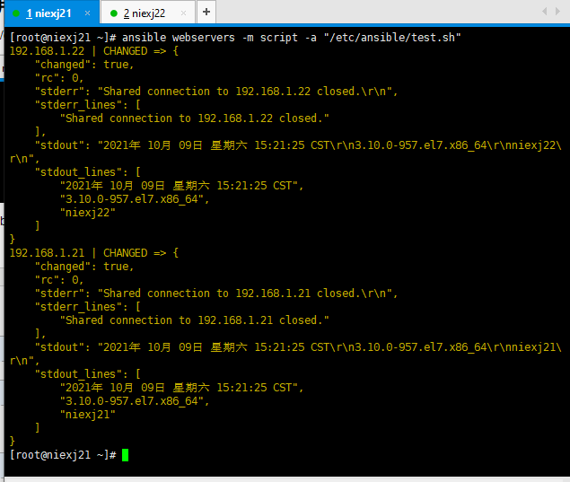 [root@niexj21 ~]# ansible webservers -m script -a "/etc/ansible/test.sh"