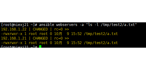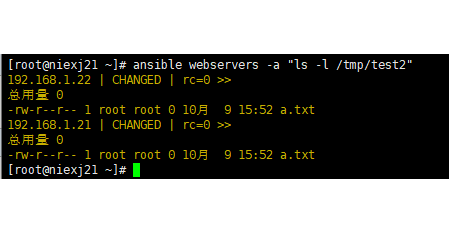[root@niexj21 ~]# ansible webservers -a "ls -l /tmp/test2/a.txt"