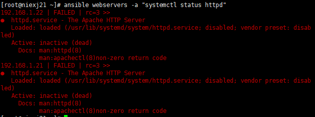 [root@niexj21 ~]# ansible webservers -a "systemctl status httpd"