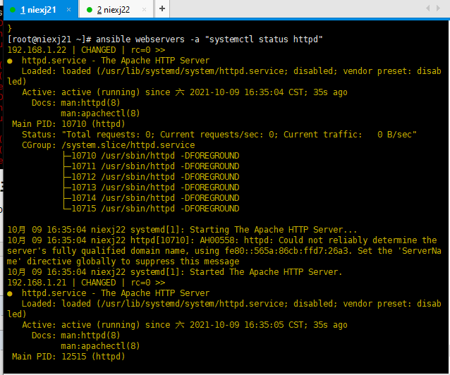 [root@niexj21 ~]# ansible webservers -m service -a "name=httpd state=started"