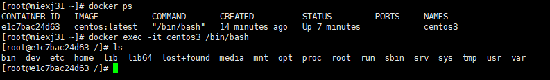 [root@niexj31 ~]# docker exec -it centos3 /bin/bash