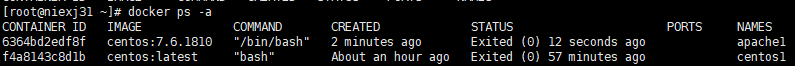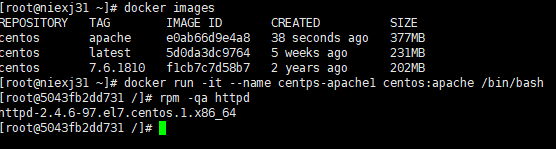[root@niexj31 ~]# docker run -it --name apache1 centos:7.6.1810 /bin/bash