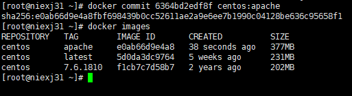 [root@niexj31 ~]# docker commit 6364bd2edf8f centos:apache