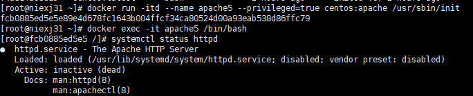 [root@niexj31 ~]# docker run -itd --name apache5 --privileged=true centos:apache /usr/sbin/init