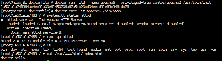 [root@niexj31 dockerfile]# docker run -itd --name apache6 --privileged=true centos:apache2 /usr/sbin/init