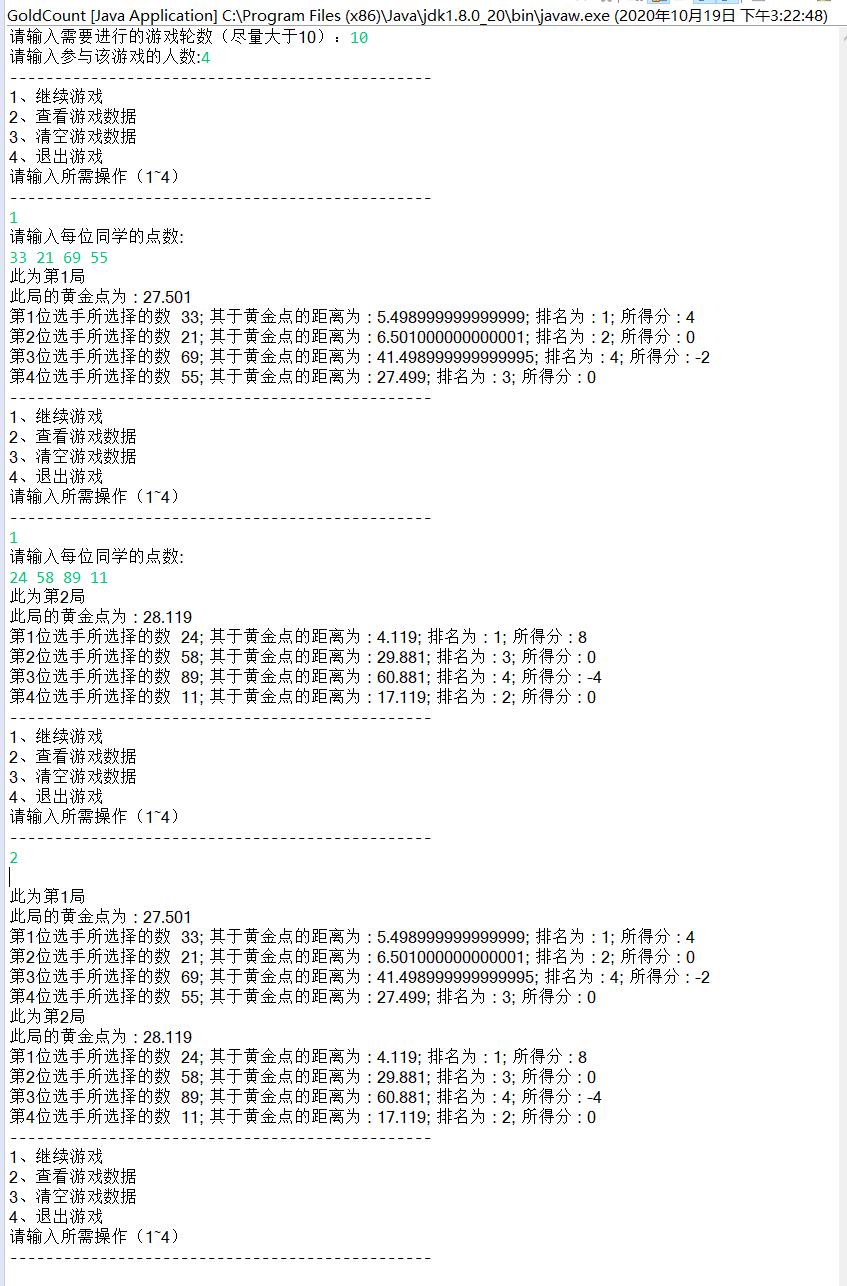 public class GoldCount { static String path = "D:\\Project\\code\\java\\GoldCount\\src\\data.txt"; //导出的数据 static int [] score = new int[100]; //得分,人数尽量不大于100 public static void main(String[] args) throws IOException { WriteDate(); Scanner input = new Scanner(System.in); System.out.print("请输入需要进行的游戏轮数(尽量大于10):"); int round = input.nextInt(); System.out.print("请输入参与该游戏的人数:"); int n = input.nextInt(); for(int sur = 0;sur < round;sur++ ) { int Qstate = 1; int Dstate = 1; while(1 == 1) {//不用switch语法是因为不好控制选项 menu(); int choice = input.nextInt(); if(Dstate == 0) { WriteDate(); Dstate = 1; } if (choice == 1) { while(1 == 1) {//用于处理数据异常 int Mstate = Count(n,sur+1); if (Mstate == 1) { System.out.println("输入的数据有误,请重新输入!"); } else { break; } } break; } else if (choice == 2) { //System.out.println("现在是第" + sur + "轮"); Readdata(); //返回至循环开始 } else if (choice == 3) { Delete(); Dstate = 0; } else if (choice == 4) { Qstate = 0; break; } else { System.out.println("输入有误,请重新输入!"); //返回至循环开始 } } if(Qstate == 0) { break; } } }