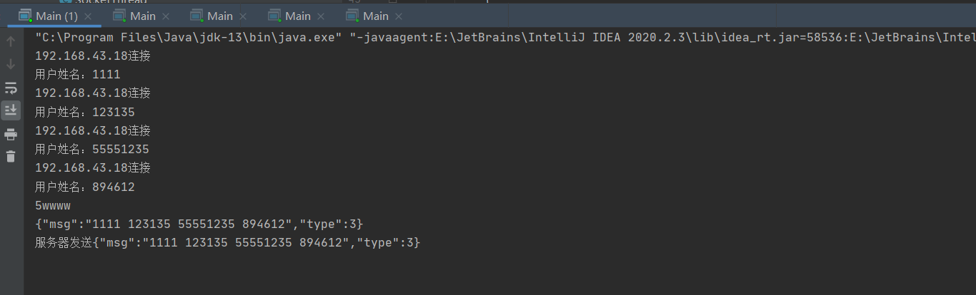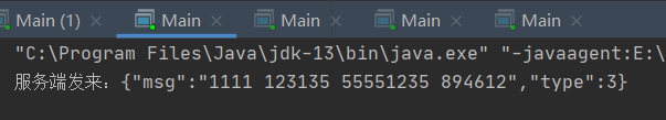 @Override public void run() { try { DataInputStream dis = new DataInputStream(socket.getInputStream()); DataOutputStream dos = new DataOutputStream(socket.getOutputStream()); dos.write(player_name.getBytes()); while (true) { //repaint(); byte[] b = new byte[3000]; dis.read(b); String msg = new String(b).trim(); System.out.println("服务端发来:" + msg); JSONObject json = new JSONObject(msg); int commandType = json.getInt("type"); switch (commandType){ case 1: //收到确认玩家提交数据 (提示玩家等待其他人提交) break; case 2: //收到确认所有玩家已经提交数据 (返回黄金点,游戏结果等数据) break; case 3: //收到玩家姓名,等信息 (设置相关文本) break; case 4: //收到提交玩家数字的命令 (设置轮数文本,显示提交按钮,提示玩家输入数据) break; default: System.out.println("json数据不合法"); break; } } } catch (IOException e) { e.printStackTrace(); } catch (JSONException e) { e.printStackTrace(); } } boolean isString(String string) { try{ int num = Integer.valueOf(string); return true; }catch(Exception e){ return false; } }