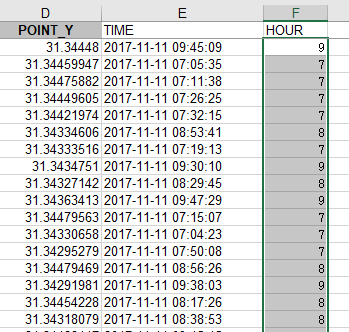 8、 在Excel表格中将微博签到点时间数据中的小时提取出为一个新字段。