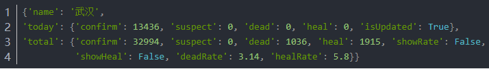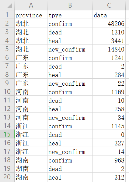 表示广东省疫情数据,我们设置循环就能获取所有数据。其数据包括当日数据(today)和累计数据(total),confirm表示确诊、suspect表示疑似、dead表示死亡、heal表示治愈。