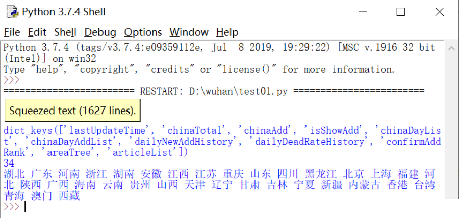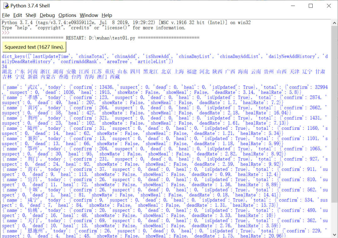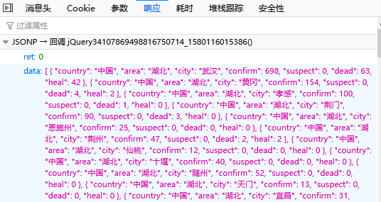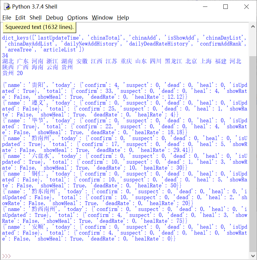 接着通过 num[0][‘children’] 获取湖北省的疫情数据,代码如下: