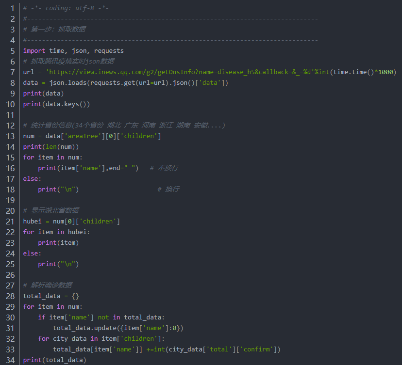 注意,初始化每个省份人数为0,然后循环累加该省所有城市的确诊人数,调用 city_data[‘total’][‘confirm’]
