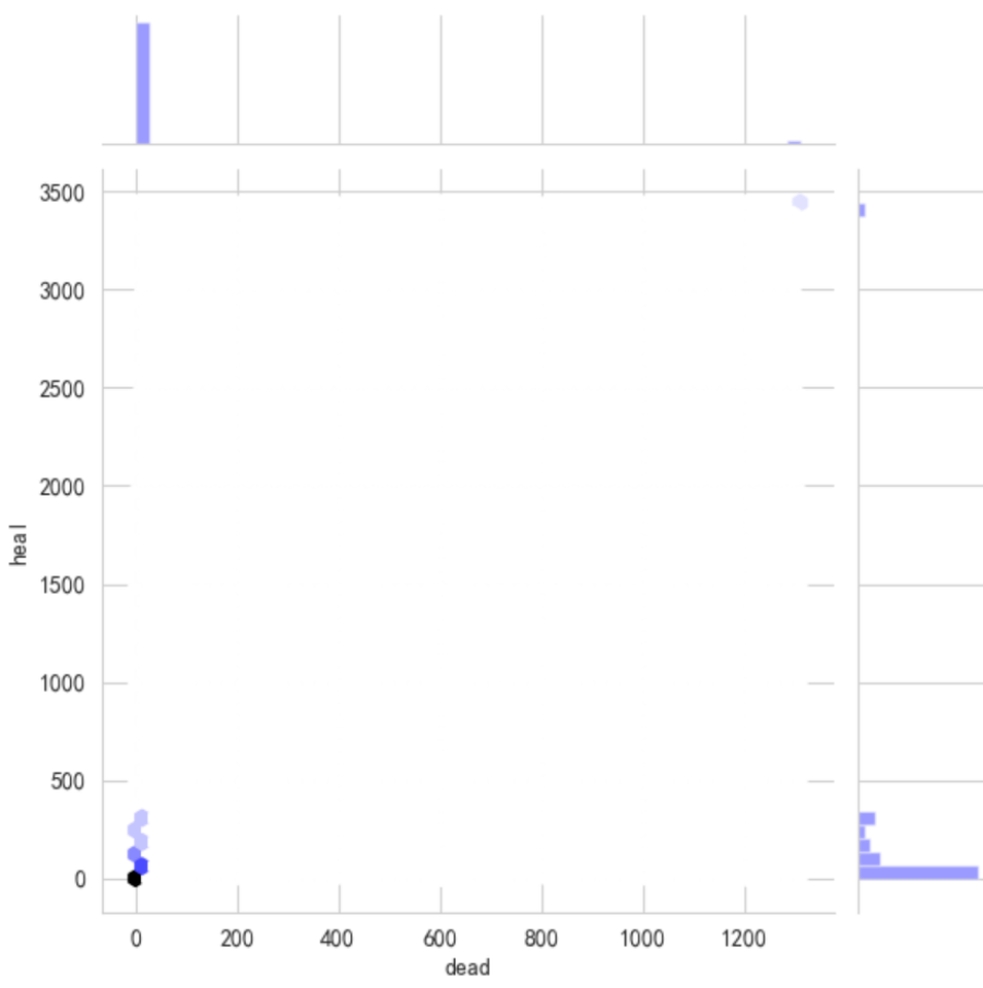 sns.jointplot(x=“dead”, y=“heal”, data=data, color=“b”, kind=‘hex’)