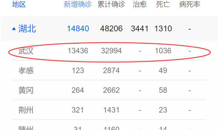 我们将所抓取的数据和真实的数据进行对比,武汉截止2月13日下午4点,新增确诊人数13436、累计确诊32994,发现是完全一致的。