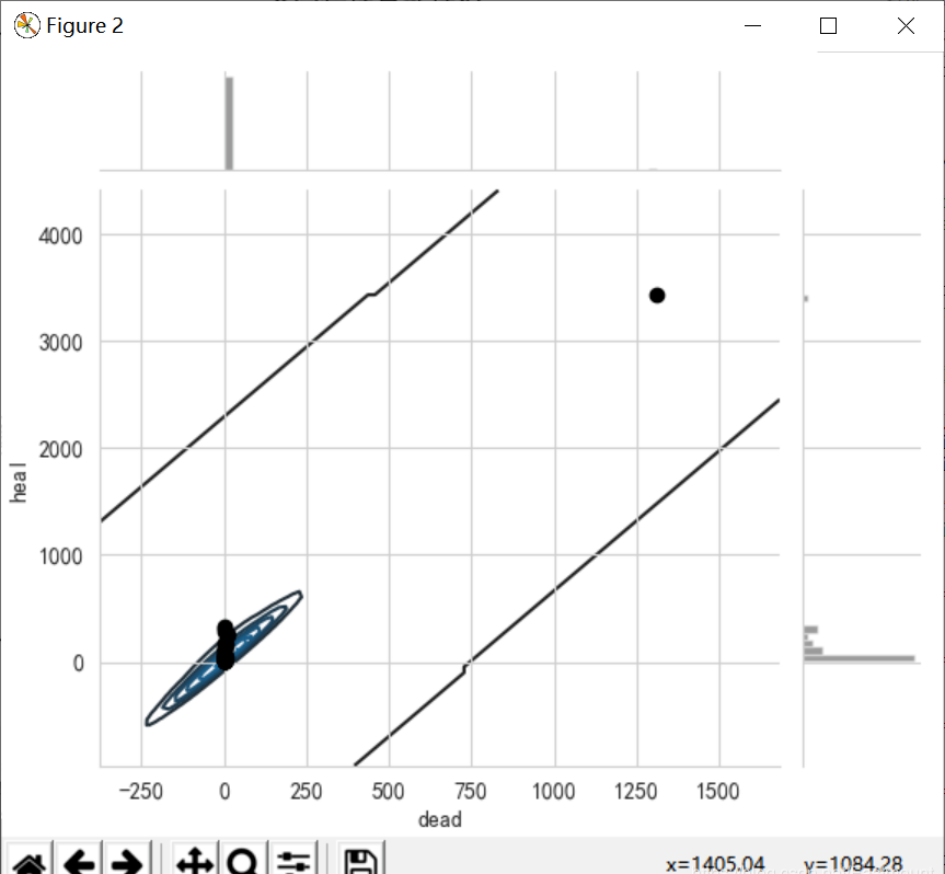 g = (sns.jointplot(x=“dead”, y=“heal”, data=data, color=“k”).plot_joint(sns.kdeplot, zorder=0, n_levels=6))