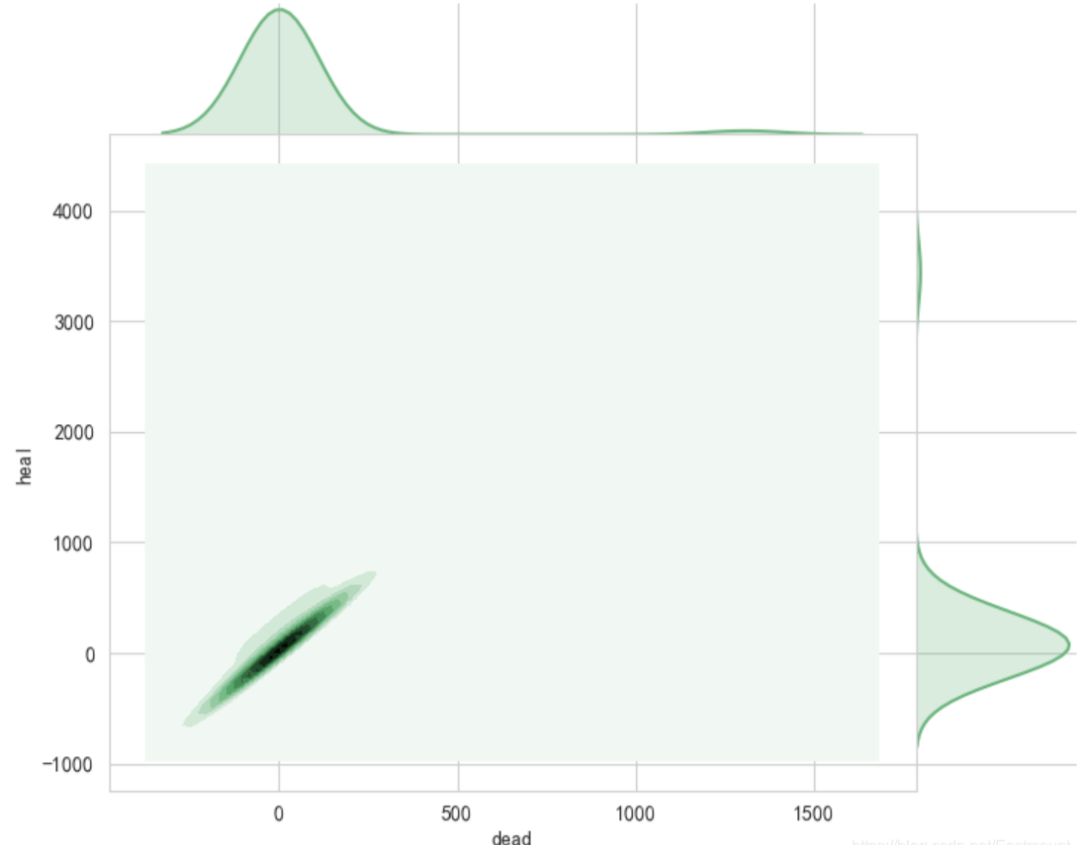 sns.jointplot(x=“dead”, y=“heal”, data=data, kind=“kde”, space=0, color="#6AB27B")