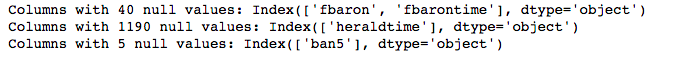 结果显示有两个字段有40个缺失值,一个字段有1190个缺失值,一个字段有5个缺失值。在确定缺失值的处理方式之前要先看看这些值都是什么类型,有什么含义。