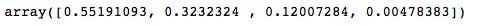 因为我们没有设定LDA模型的n_component参数,所以component的个数是模型自己决定的,也就是n_class-1=5-1=4。在4个component中,最高的解释度为55%,最小的仅为0.4%,这四个解释度加起来的和为1。