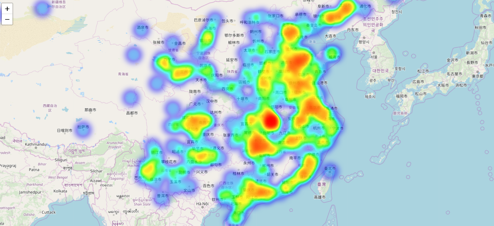 工具,绘制了城市提及频次的地理分布地图(即下图),由图可以清晰的看出祖国各大城市基本都有提及到,这也说明了此次疫情已经蔓延至全国各地,从图中还可以看出颜色最深的地方是湖北武汉市,这也印证了武汉是此次疫情的爆发中心,在各个网站的报导文章中频繁出现。