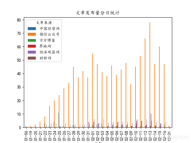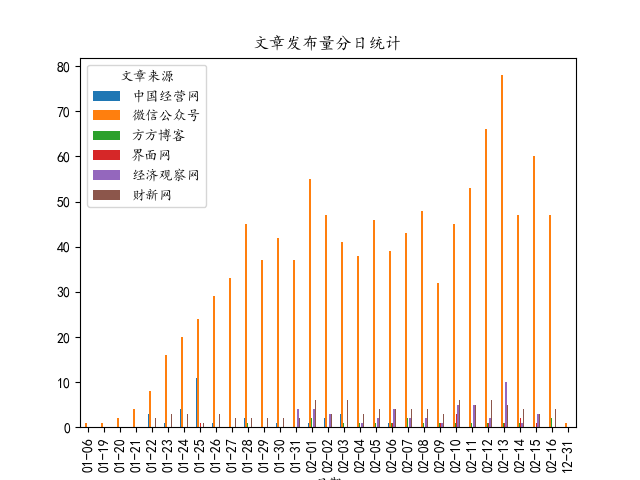 从下图可以看出,统计的文章数量从1月6号到1月28号逐步增加,之后至今保持相对稳定,均值在40篇左右。此外可以看出每日文章的来源,可以很明显的看出文章基本上都来自微信公众号,由此可以看出微信公众号在新媒体传播途径中的重要地位。