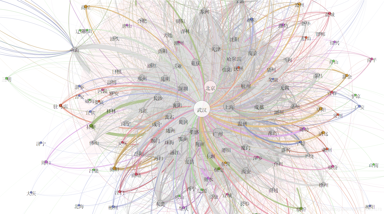,获得下图,可以看出大部分城市直接的相互关系,并且可以看出流动量大、交错密集的区域无疑是武汉,这样表现了武汉是这个舆论的中心。对于孤立的点,表明的是这个城市是在报道中单独出现。