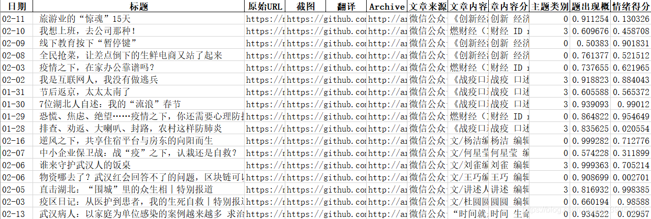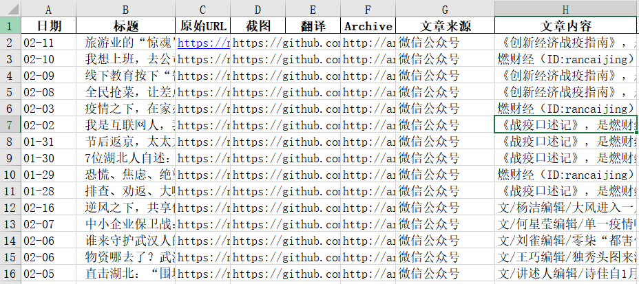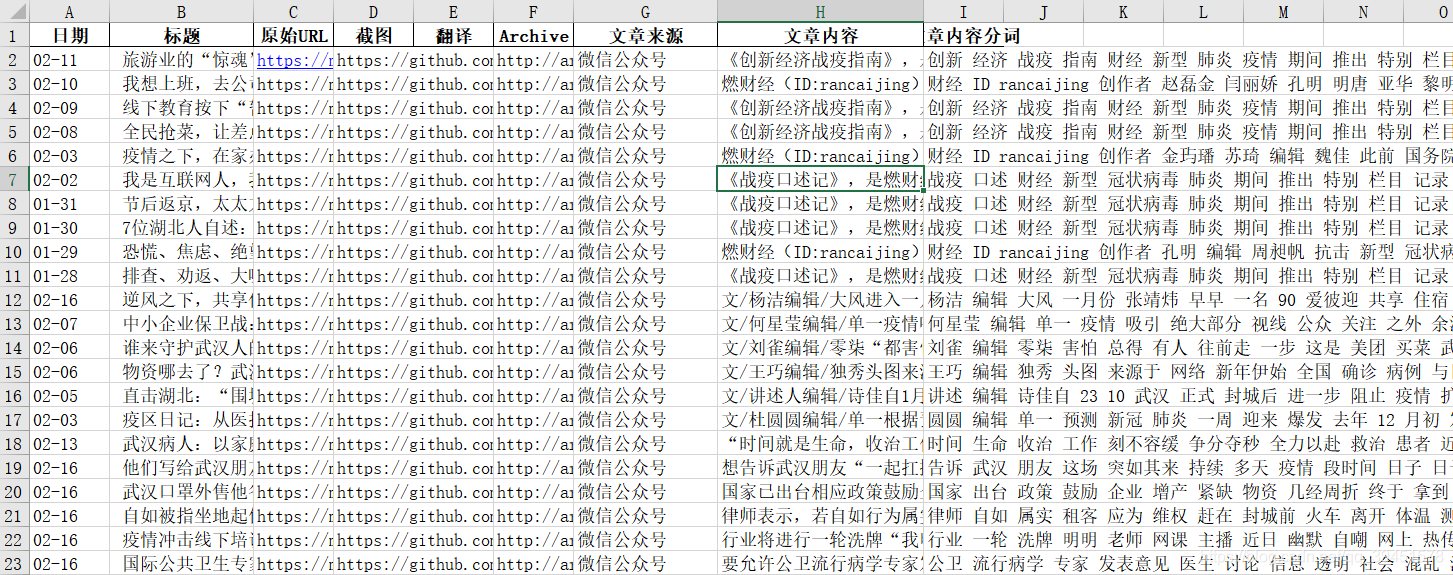 这篇文章中进行数据获取,本人采取的方法是利用爬虫,获取该文章页面,获取所列文章列表及其原文链接,进而通过链接获取文章具体内容。截至2020-2-17我获取的链接数1351个,分析知道,这些链接主要来源于:微信公众号、财经网、经济观察网、方方博客、中国经营网专题、界面网,1351个链接中来自这几个网站文章数量为1324个,其余的只有27个,不到2%,直接舍弃。于是利用爬虫分别从链接对应网站获取文章内容,并整理到excel中。