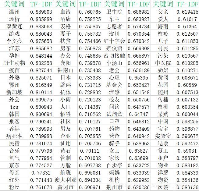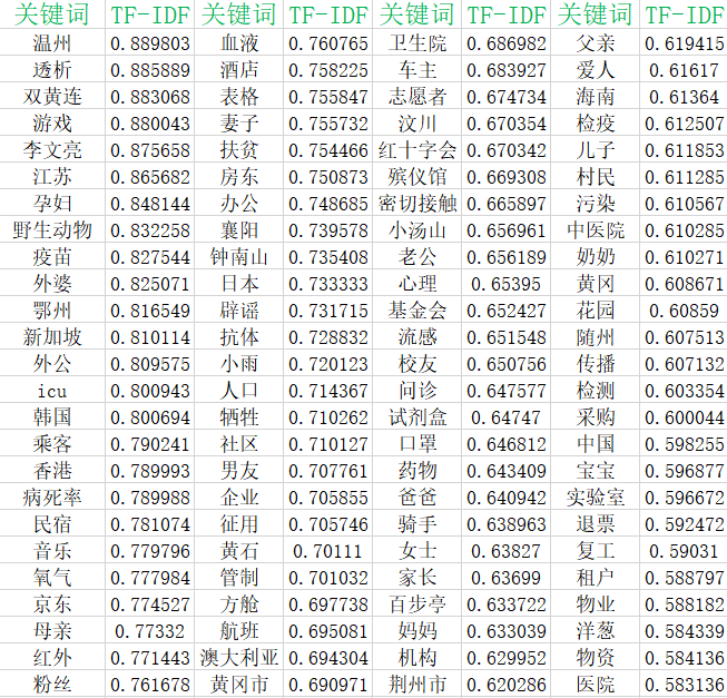 IDF更能体现一个词的重要性,以此作为提取关键词的依据相对而言更为合理,当然由于实际问题,直接使用会导致人名优先出现,缺乏分析的准确性,可以通过调整TfidfVectorizer函数的min_df参数(本文采用的值是0.023),对模型进行一定程度调整,最终将获取的结果按TF-