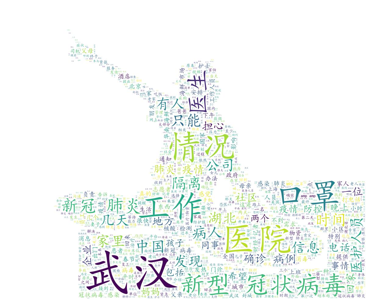 从中我们可以看出这些文章报道了各地疫情、治疗的现状和方法、药物等,同时由于素材包括很多病人自述,所以出现大量人物相关词汇,包括医生以及任务称呼等。