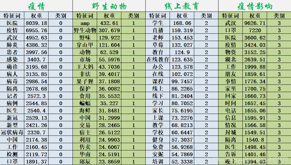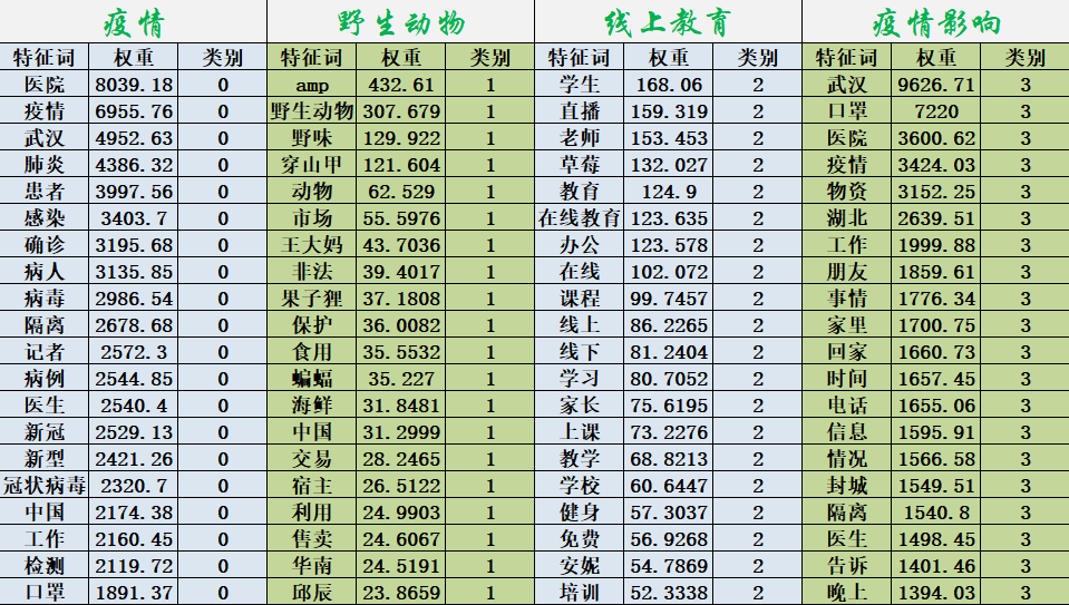 learn中的LatentDirichletAllocation()函数进行实现的,其中指定的类别经多次尝试发现设置为4类结果较好,并提取了四个主题的权重前20的主题词,整理的结果为下图:
