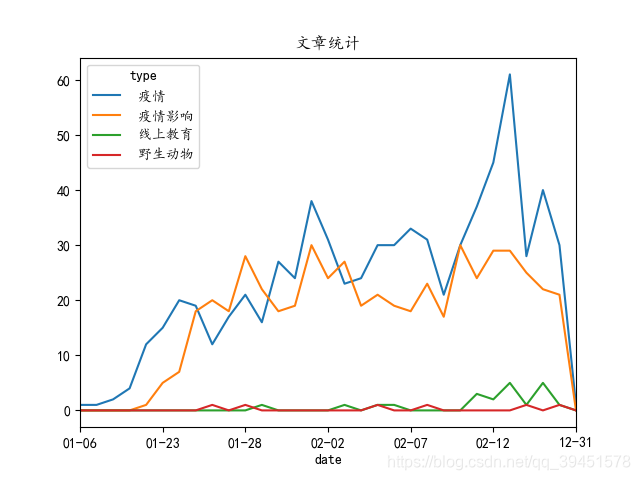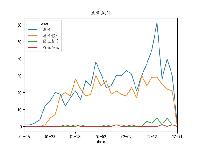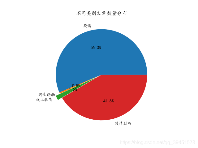 统计每个主题类别的文章占比,得到如下图,可以看到关于疫情描述的文章占比最多,达到了56.3%,其次则为疫情影响类别的文章,占比41.6%,而线上教育和野生动物相关的占比都较少,分别占1.6%和0.5%。