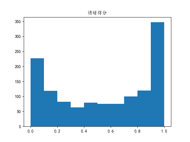 本文接着对主题分类之后又对原有标题进行了情感打分,利用的是snownlp库进行打分,获得的分数区间为[0,1],其中分数越接近1越积极,越接近0越消极,获得结果如下图:
