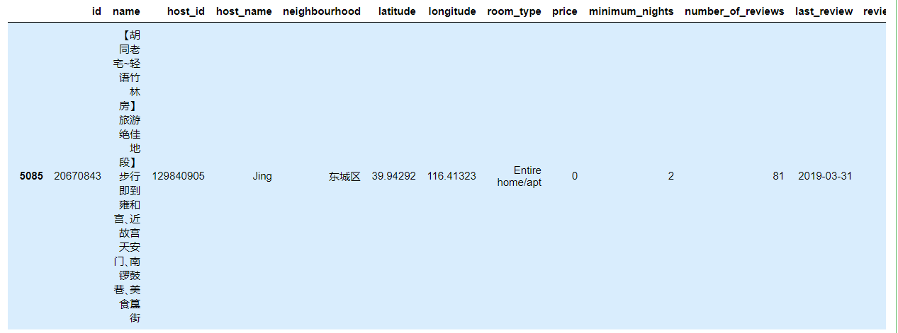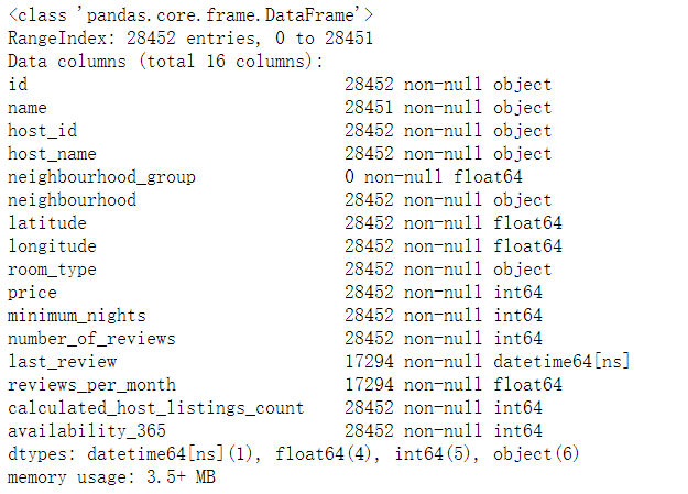 - name,last_review和reviews_per_month中都存在空值,不过影响不大,name是因为没有命名标准,last_review为空值有可能说明没有评论过,没有last_review也就没有reviews_per_month