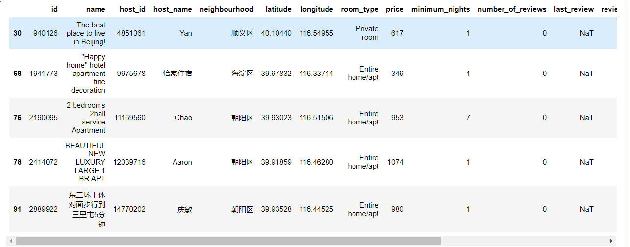 Apartments也不重要也不需要怎么处理,neighbourhood_group全为空值可以删除这列,neighbourhood可以截取为全中文列