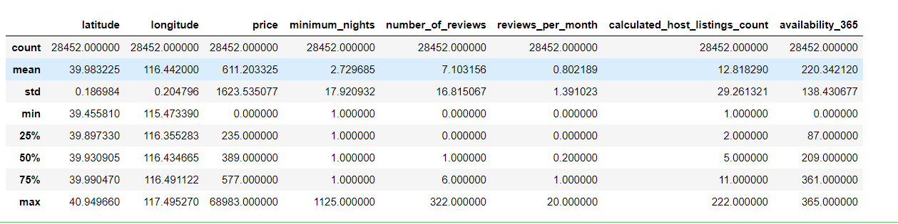 - neighbourhood_group列存在很多空值,查看统计信息