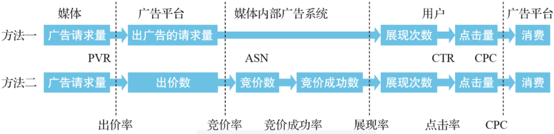 经过一段时间的使用后,笔者发现漏掉了很多节点,即广告平台把数据返回媒体后,还要经过竞价、排名才会被媒体展现给用户,完善后监控的节点变成图2-3中的第二种方式。