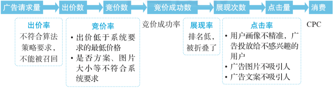 收入=实际请求数×出价率×参与竞价率×竞价成功率×(1-响应超时率)×点击率×平均点击价格