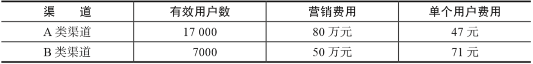 笔者曾经有一次在做渠道分析时,用了这样的组成因子分解:总费用=A类渠道费用+B类渠道费用。但之后发现,A类渠道的花费是B类渠道的1.6倍,而有效用户却是B类的2.4倍(见表2-1)。在这之前,B类渠道在其他项目的经验中效果是非常好的,所以市场人员都在B类渠道花精力,看到这个数据后,立刻决定去接触市面上所有的A类渠道,以便扩充优质流量。