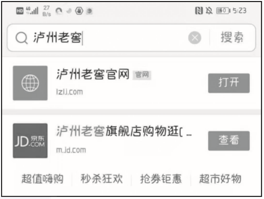 品牌词。 对于品牌词,一般搜索结果没有太大问题。但是,用户搜索品牌词时,如果给用户更权威、更专业的内容,比如品牌的官网、旗舰店等,用户体验岂不是更好?比如用户搜索“泸州老窖”这样的品牌词,直接给用户泸州老窖的官网,让用户看到权威、专业、全面的信息。图2-9为QQ浏览器的搜索sug页的处理方式。