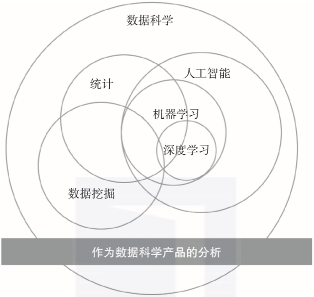 统计涉及数据的收集、组织、分析、解释和展示。如果使用这个广义的定义,它听起来和分析的概念非常像。然而,分析和数据科学都使用统计学的数量分析基础,但它们的关注范围比传统统计更广泛,而关于统计与其他学科之间的概念关系有几十个观点,我列举了我所看到的这些概念之间的关系,如图1-3所示。
