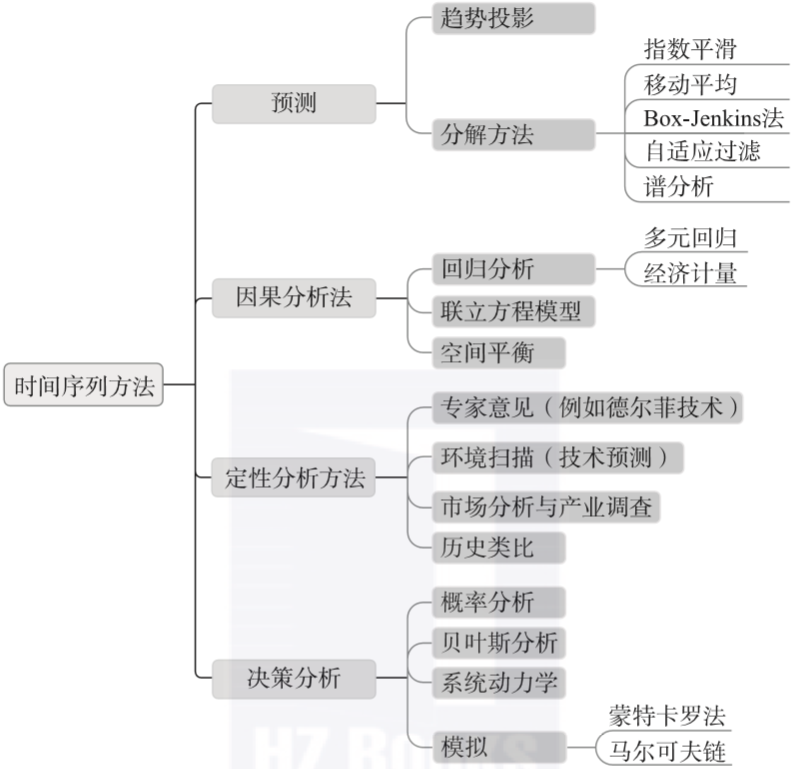 时间序列分析采用了多种方法,既有定量的,也有定性的。时间序列分析的目的是在历史数据(或时间序列数据)中找出一种模式,然后推测未来趋势。通常有四大类时间序列分析方法,如图1-5所示。