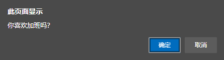 1 <html> 2 <head> 3 <title>编写html页面</title> 4 <script language= "javascript" > //JavaScript脚本标注 5 let con; 6 con = confirm( "你喜欢加班吗?" ); //页面上弹出 7 if (con == true ) 8 alert( "那是一件很美妙的事情!" ); 9 else 10 alert( "不喜欢,我想活!" ); 11 </script> 12 </head> 13 </html>